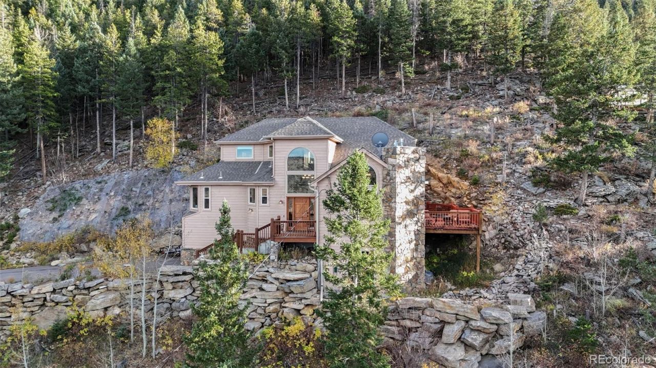 Experience unparalleled mountain living in this stunning Evergreen retreat. Situated on over 7 acres, this property offers million-dollar views and exceptional privacy. The open floor plan boasts expansive windows, a vaulted living room ceiling, and a spacious kitchen with slab granite, stainless appliances, and hardwood flooring. The main floor primary suite features a luxurious 5-piece bathroom with a soaking tub offering breathtaking views, and a private balcony. Entertain on the large main level deck while enjoying unobstructed mountain vistas. Upstairs, find two generously sized bedrooms and a full bathroom. The walkout basement includes 9 ceilings, a family room with a second fireplace, a study/home office, a fourth bathroom, and laundry. A 2-car attached garage and greenhouse complete the property. Located just minutes from I-70, Evergreen, and with easy access to Denver and skiing.